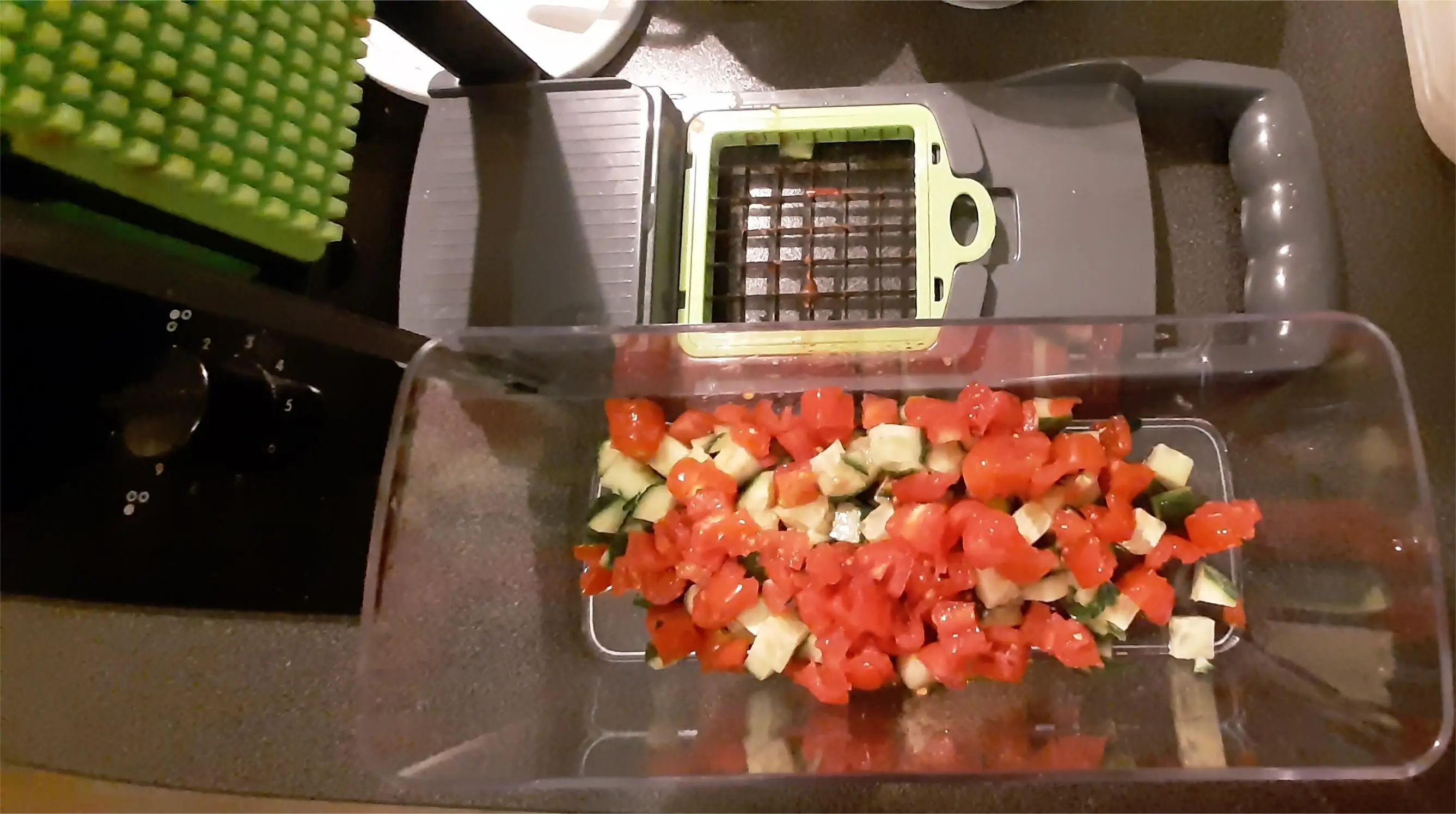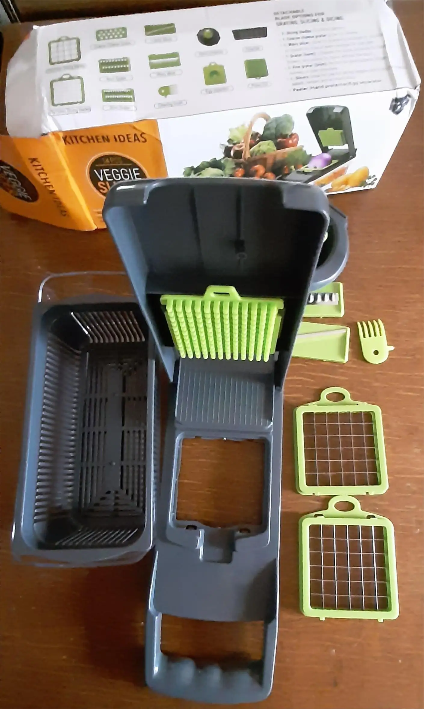 This vegetable cutter is practical and easy to clean. It makes preparing salad quick and simple. In the photo, you can see cucumber and tomatoes cut. It's very quick and easy. A very useful tool in the kitchen. I haven't tried all the attachments yet, but they look great. I'm very glad I bought this vegetable cutter.